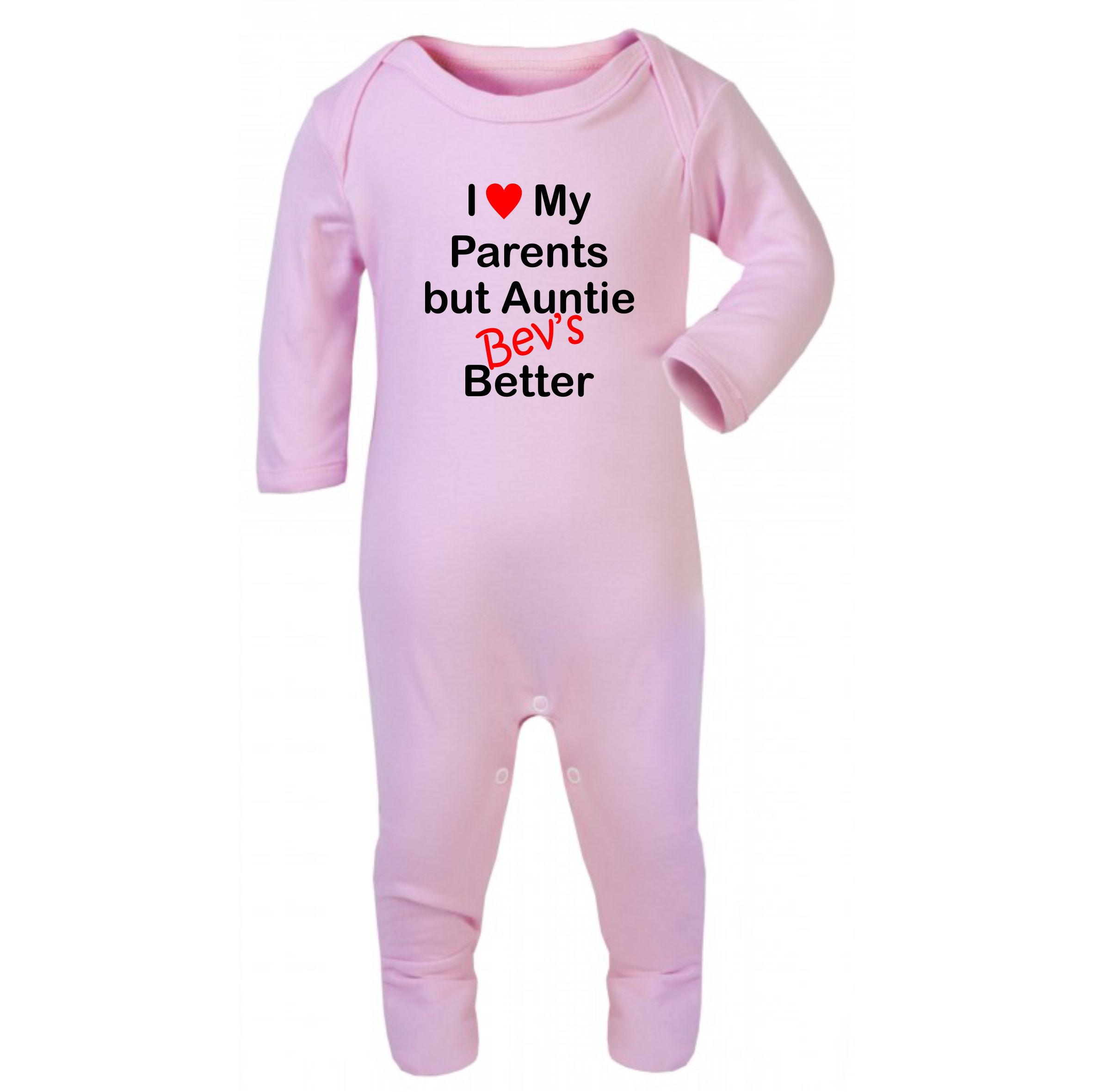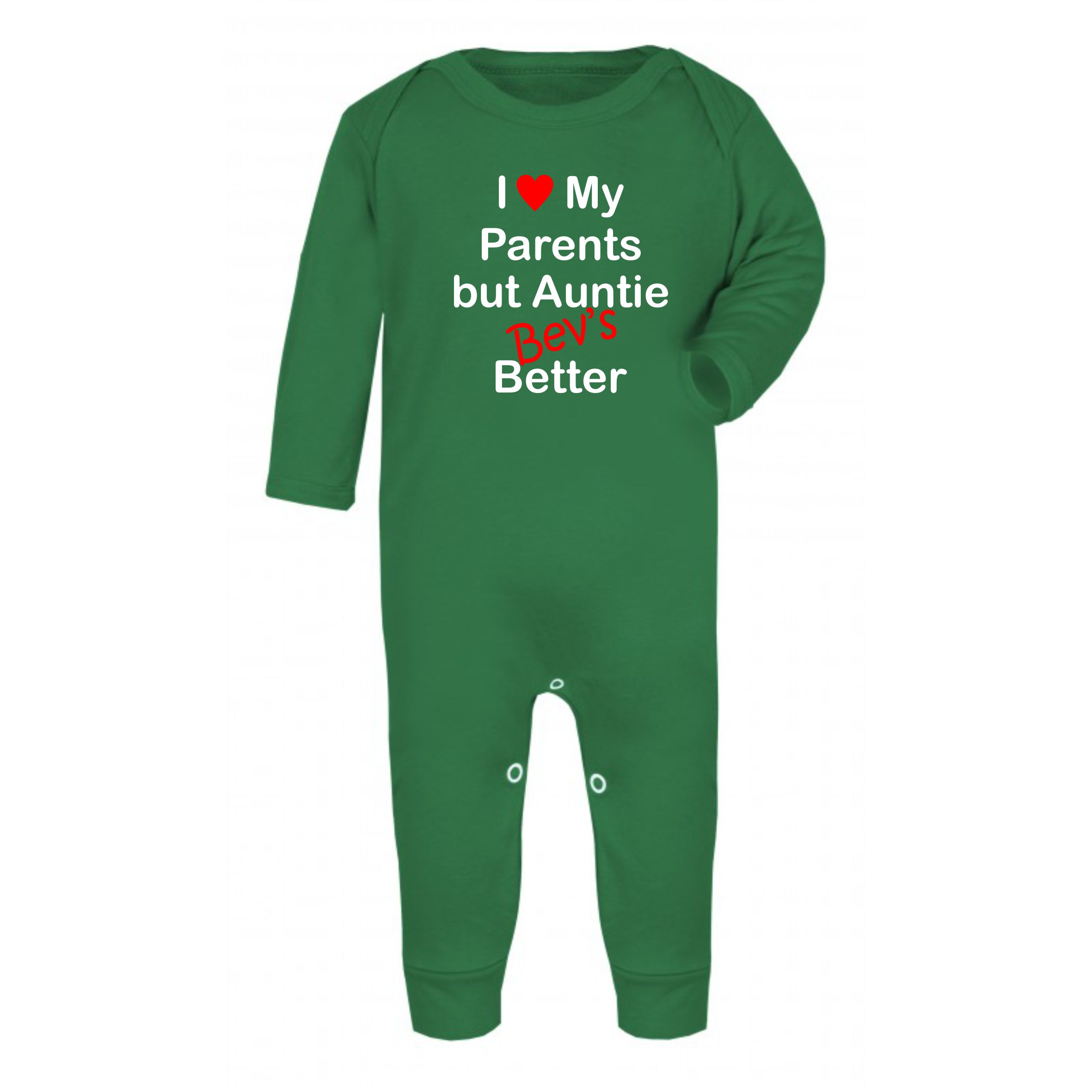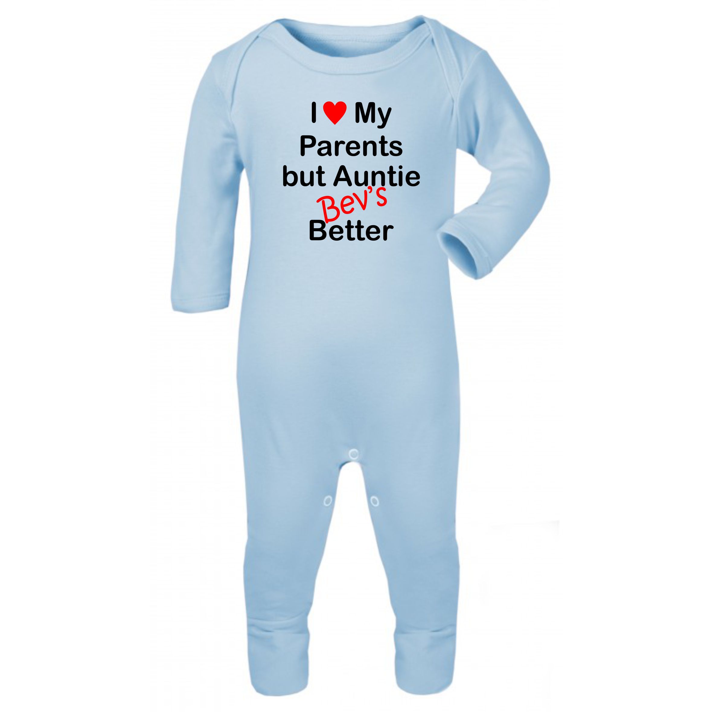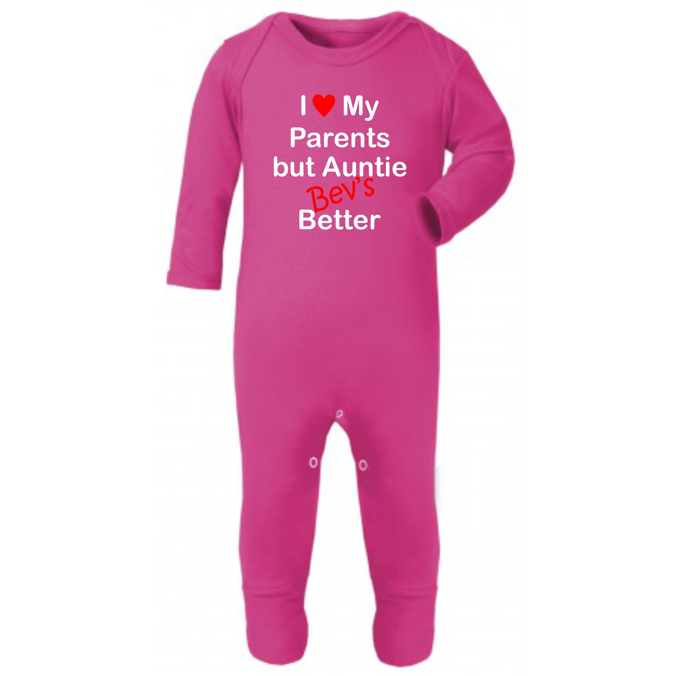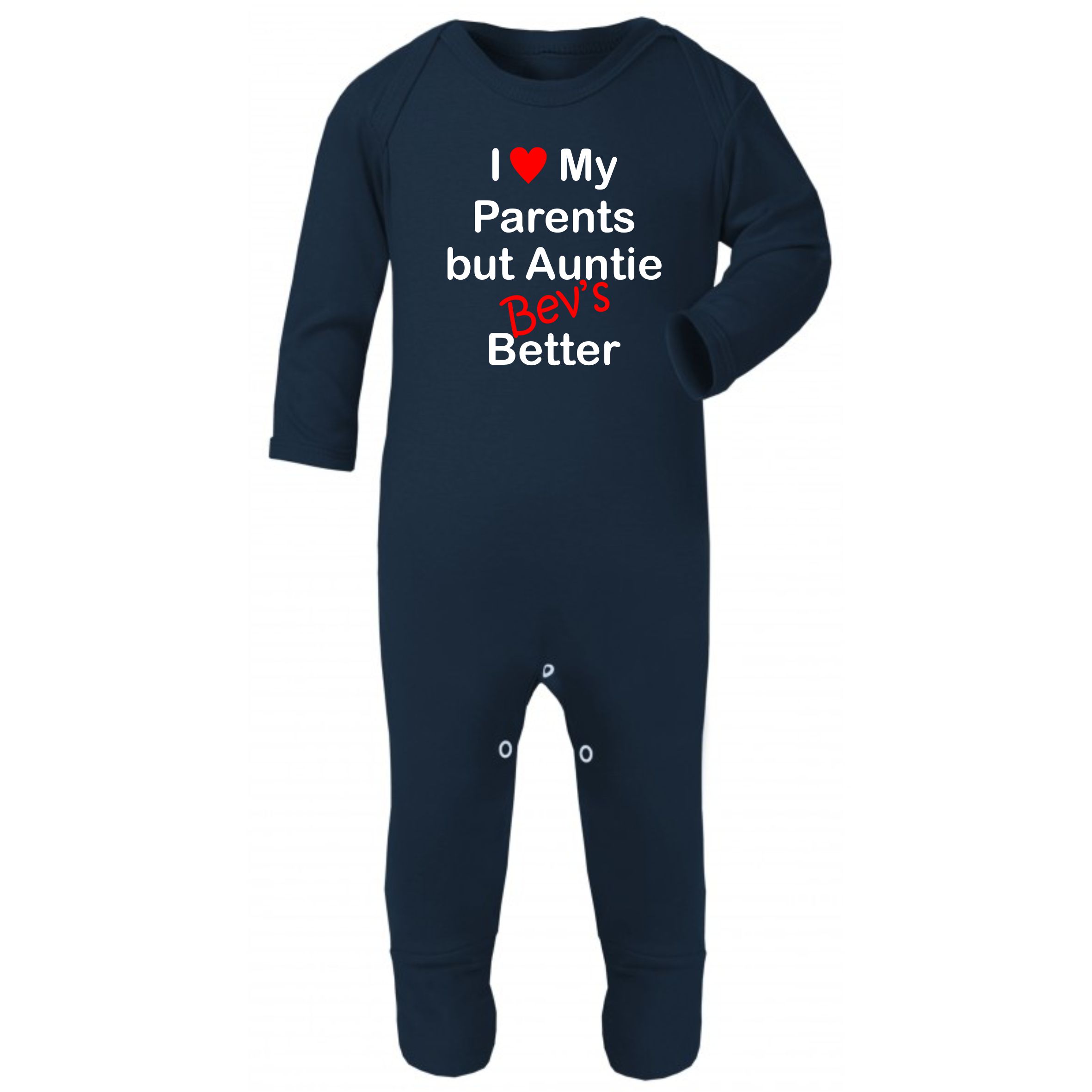 This is our I Love my Parents But Auntie (Name) Is Better Personalised long sleeve, long leg bodysuit (sleep suit/rompersuit) which is just one of our fantastic designs professionally printed onto a high quality 100% Cotton, supersoft bodysuit with nickel free poppers.