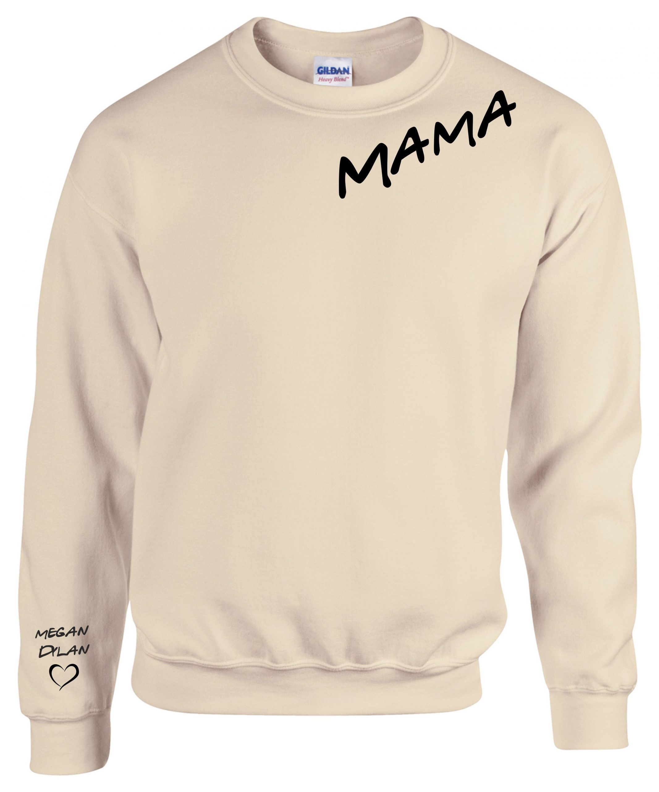 Introducing a custom printed Mama sweater with funky Friends font made here in our workshop in Yorkshire, perfect for any occasion. This unisex adults pullover sweatshirt is made with high-quality materials and comes in a regular size type. The design features a special touch with your kids’ names printed on the right or left sleeve, inside or outside. This sweater is perfect for activewear and makes for a great addition to any wardrobe and would be a great gift for any occasion whether it is Mother’s Day, Birthday or just as a special gift to say Thank You