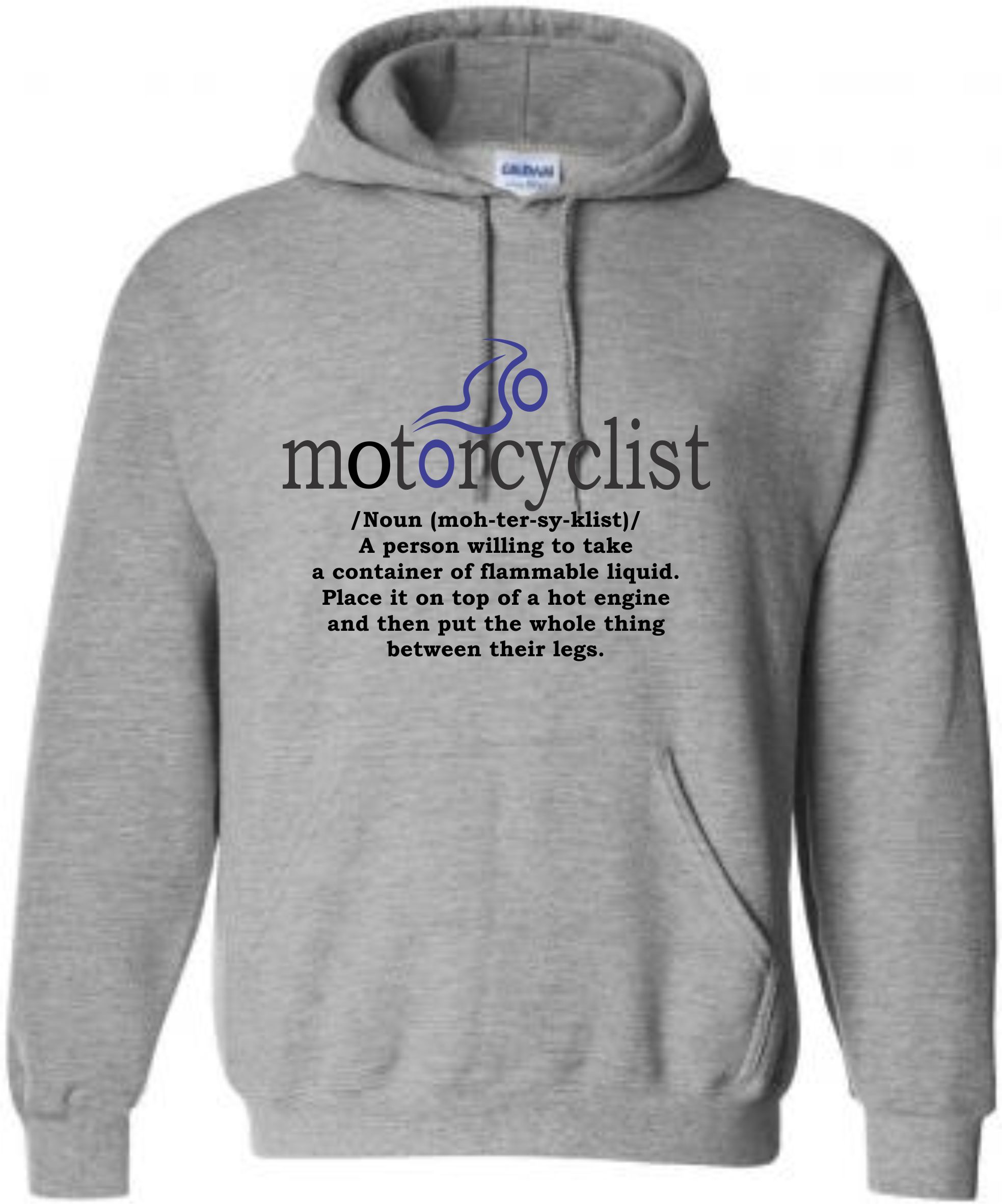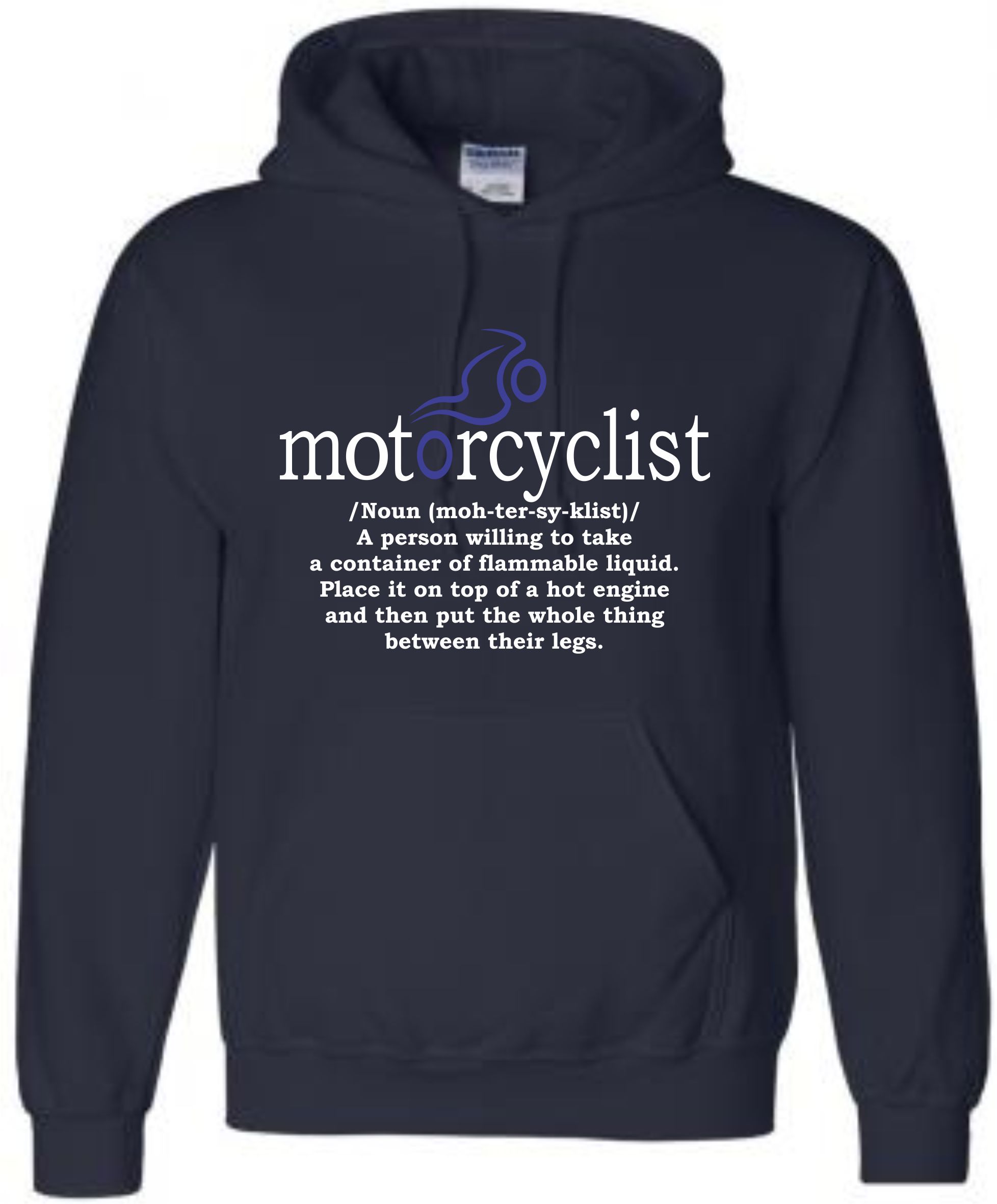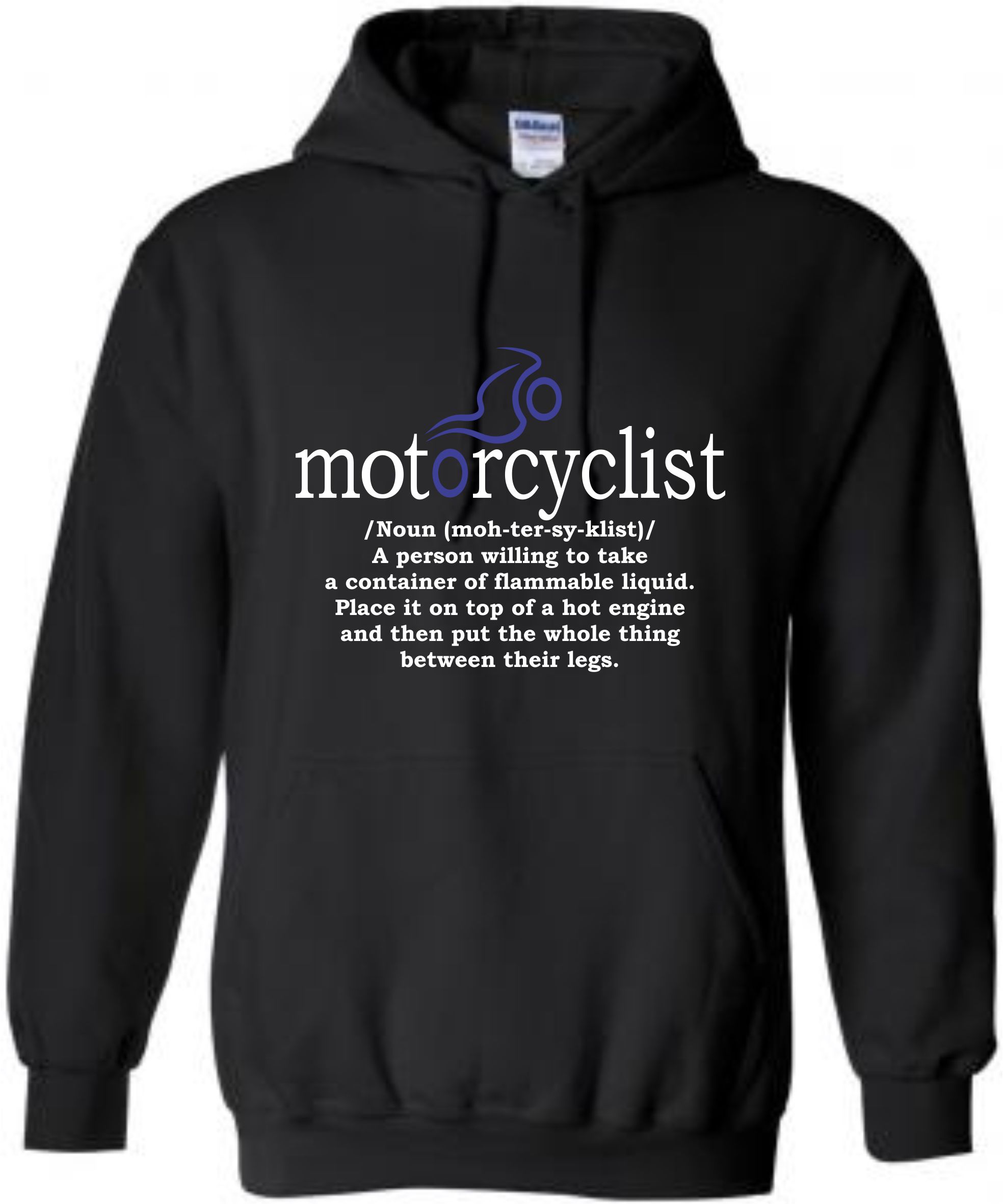 This is our funny Motorcyclist noun – A person willing to take a container of flammable liquid. Place it on top of a hot engine and then put the whole thing between their legs hoodie.