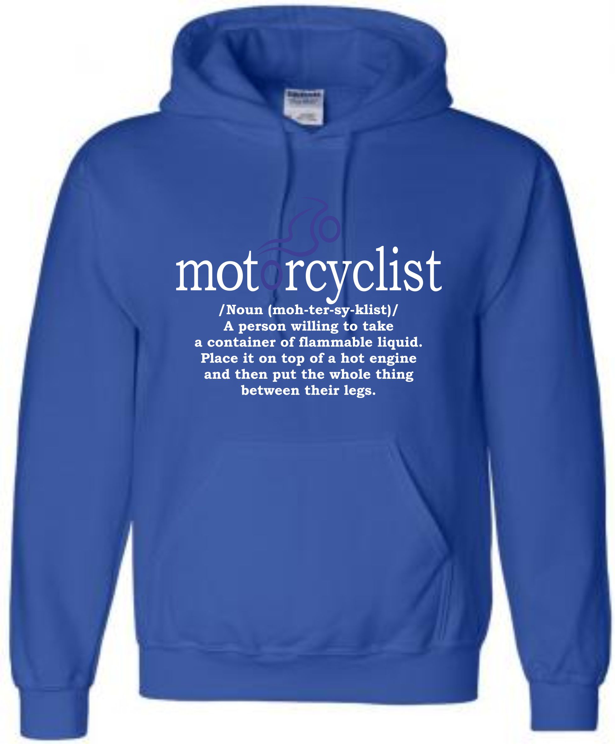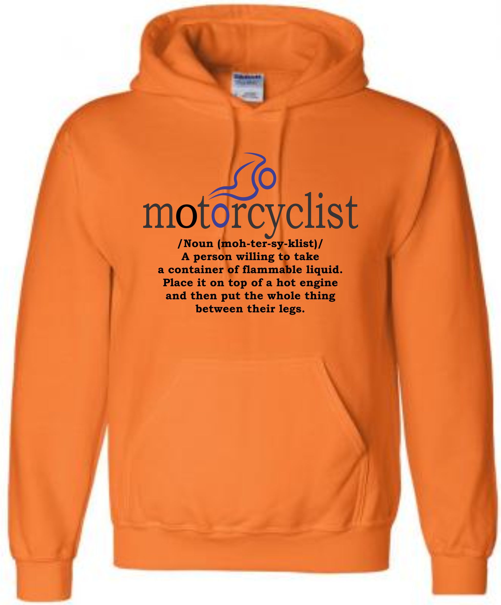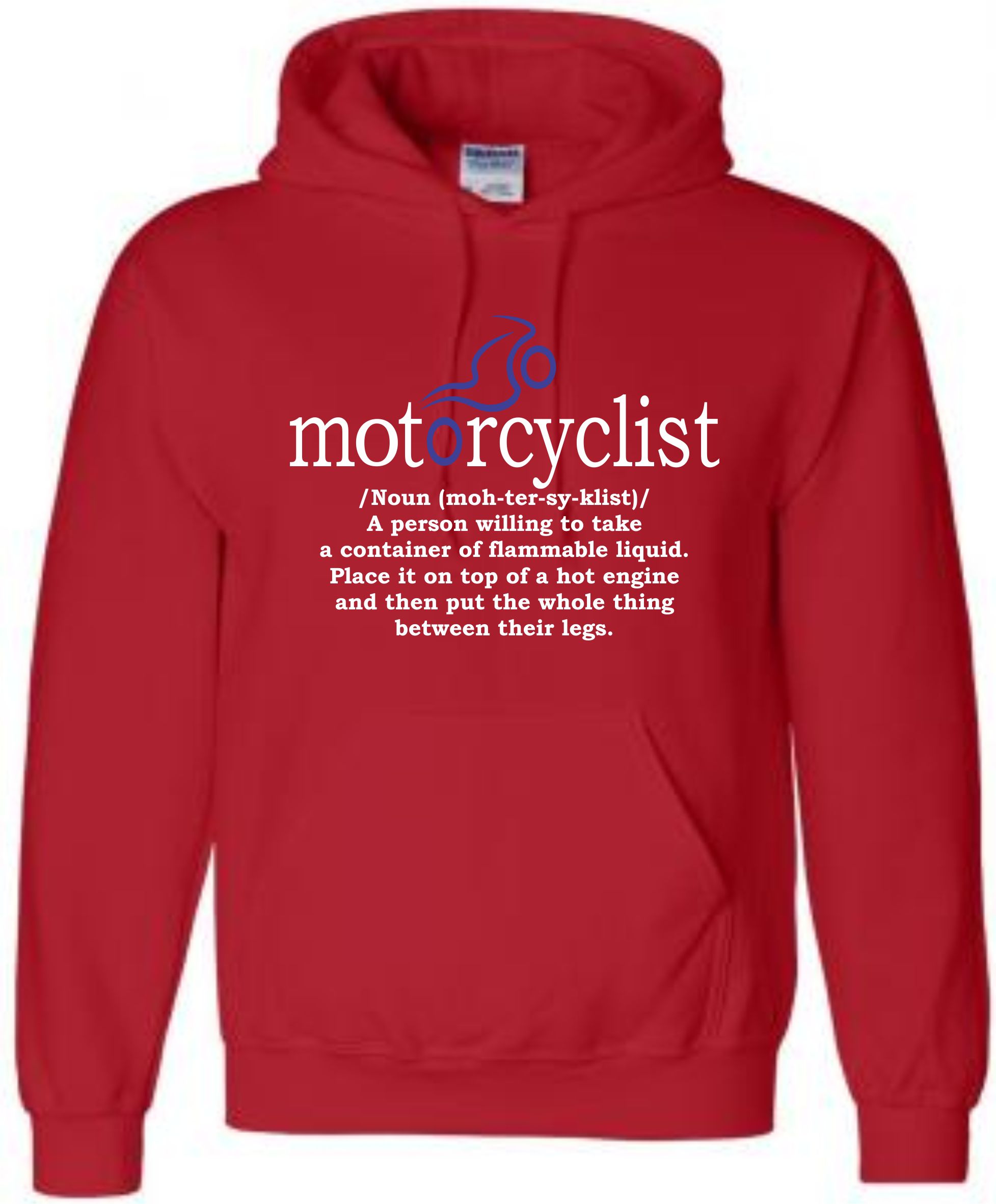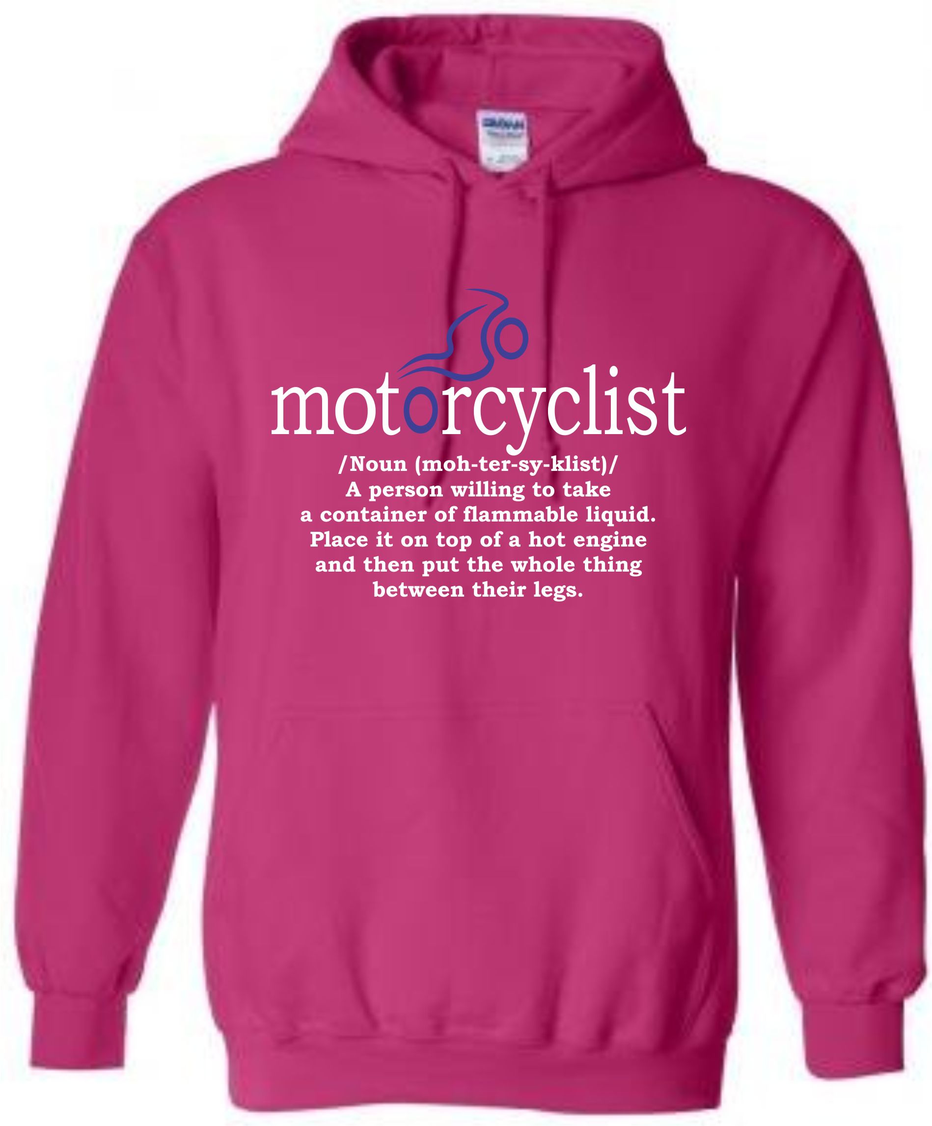 This is our funny Motorcyclist noun – A person willing to take a container of flammable liquid. Place it on top of a hot engine and then put the whole thing between their legs hoodie.