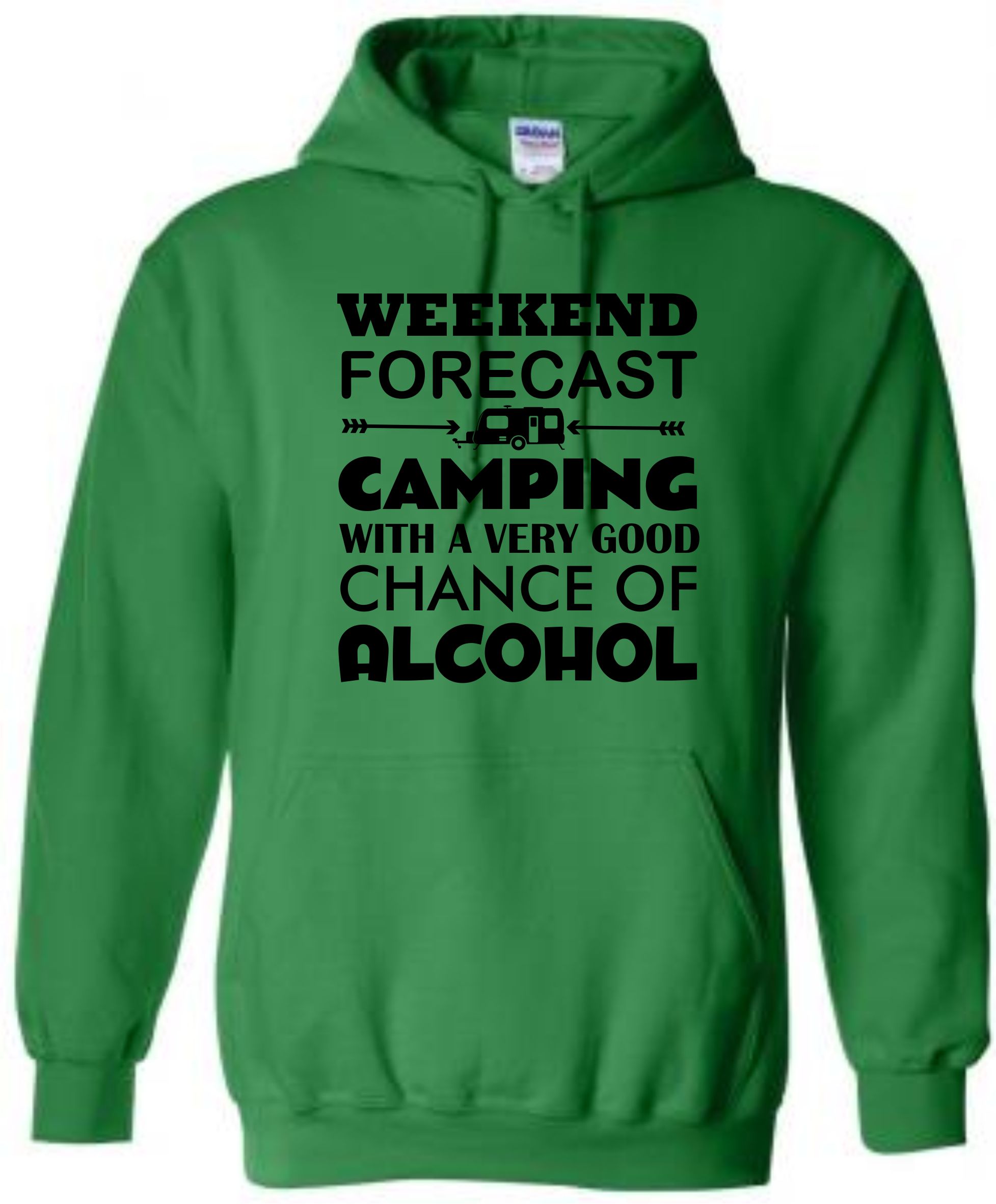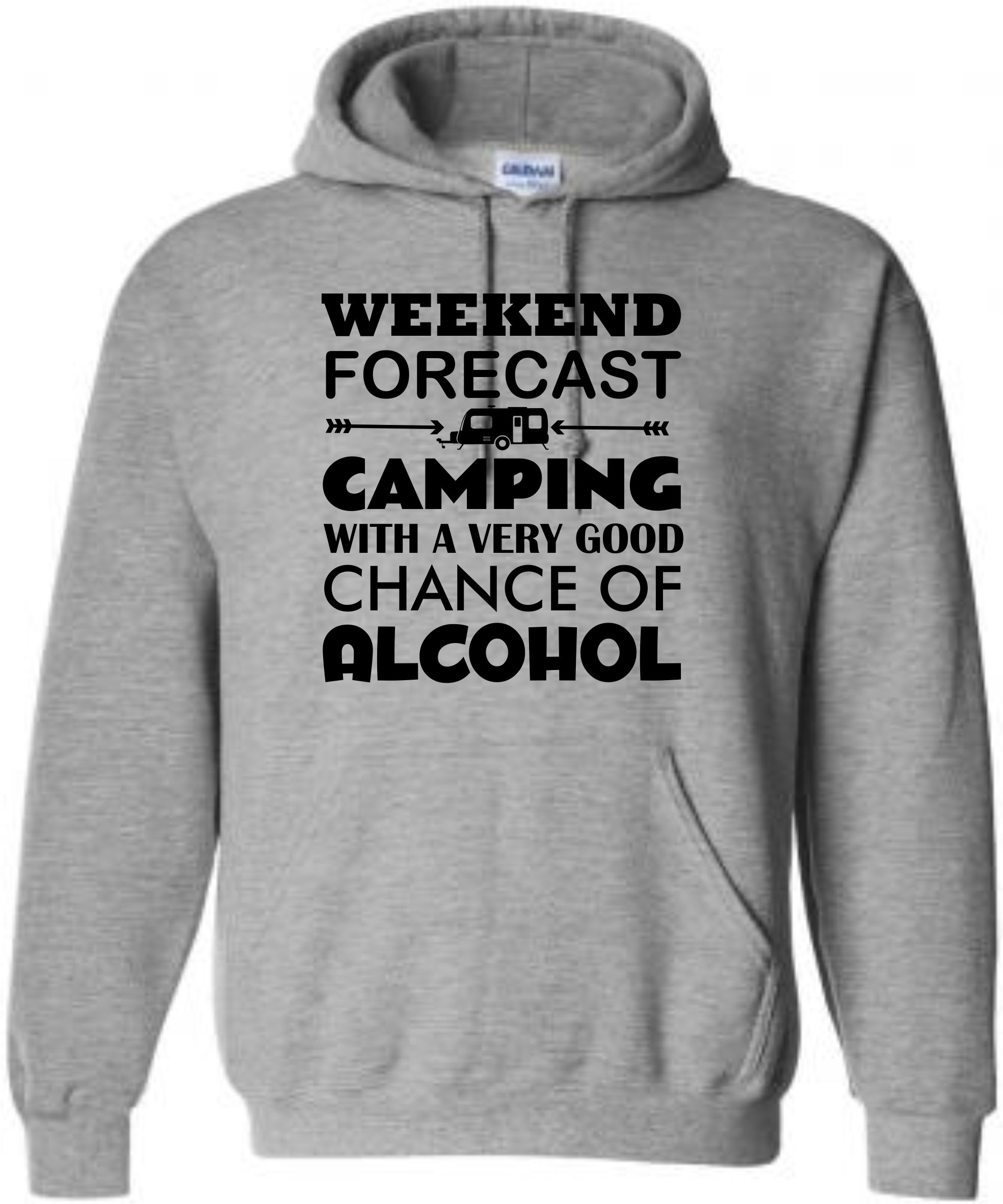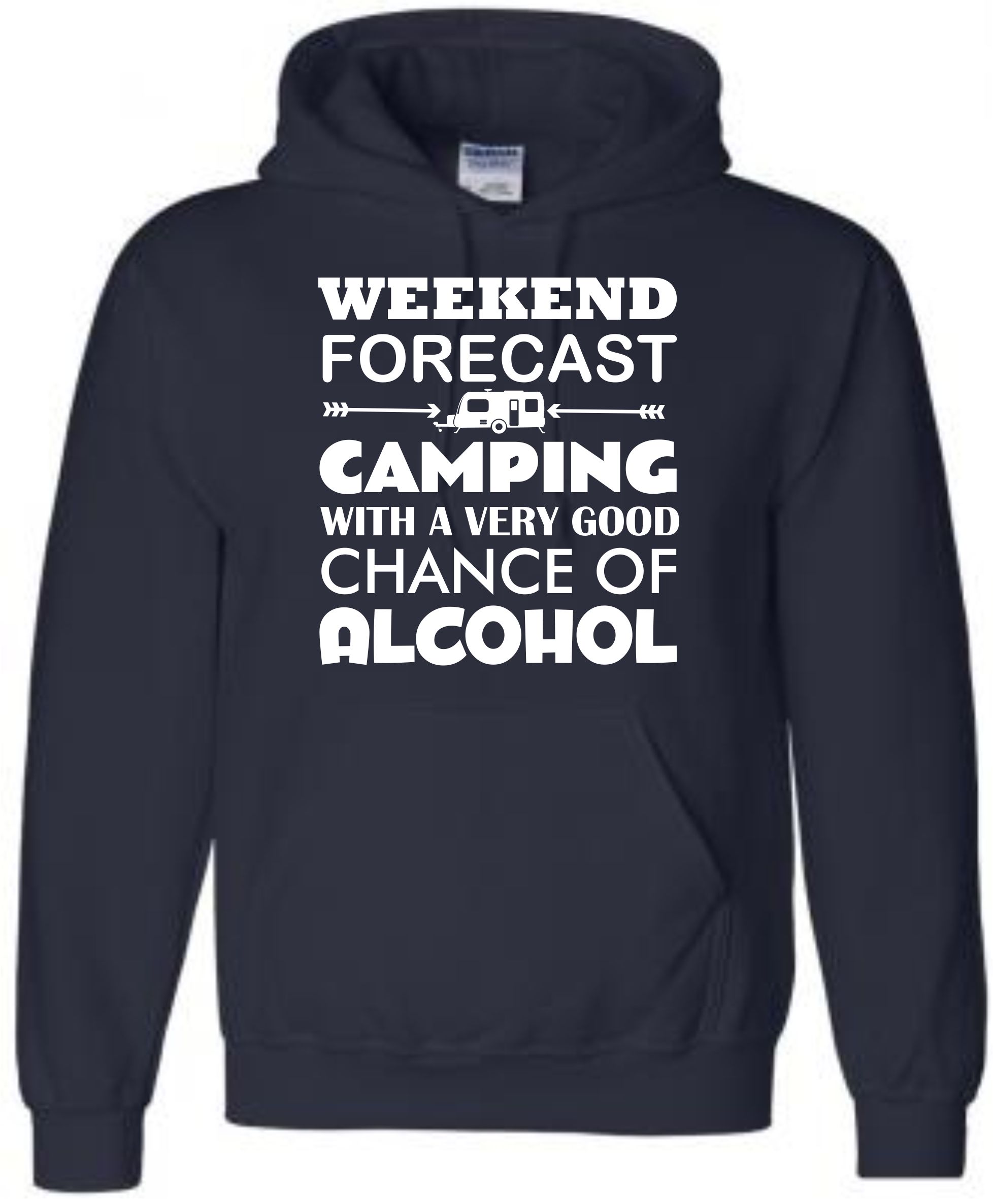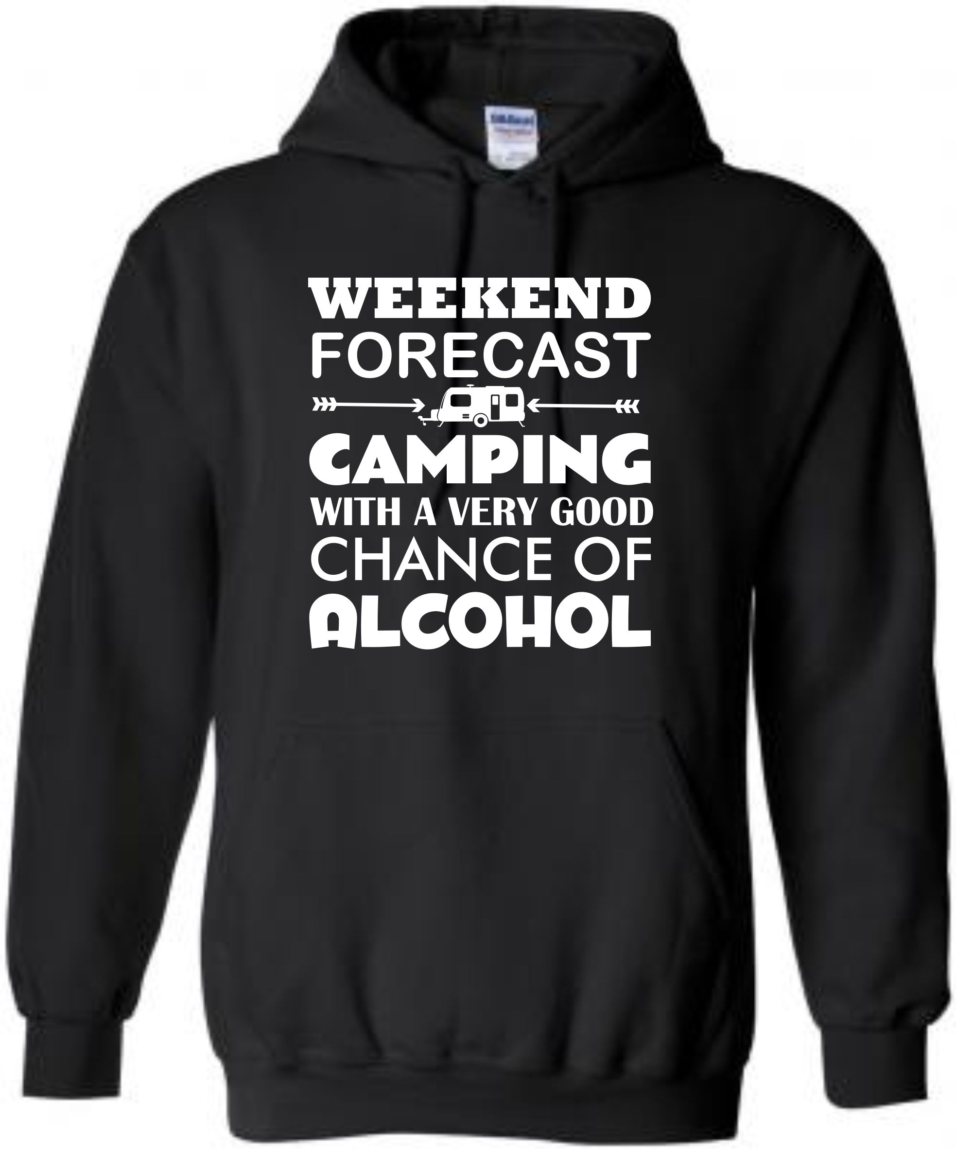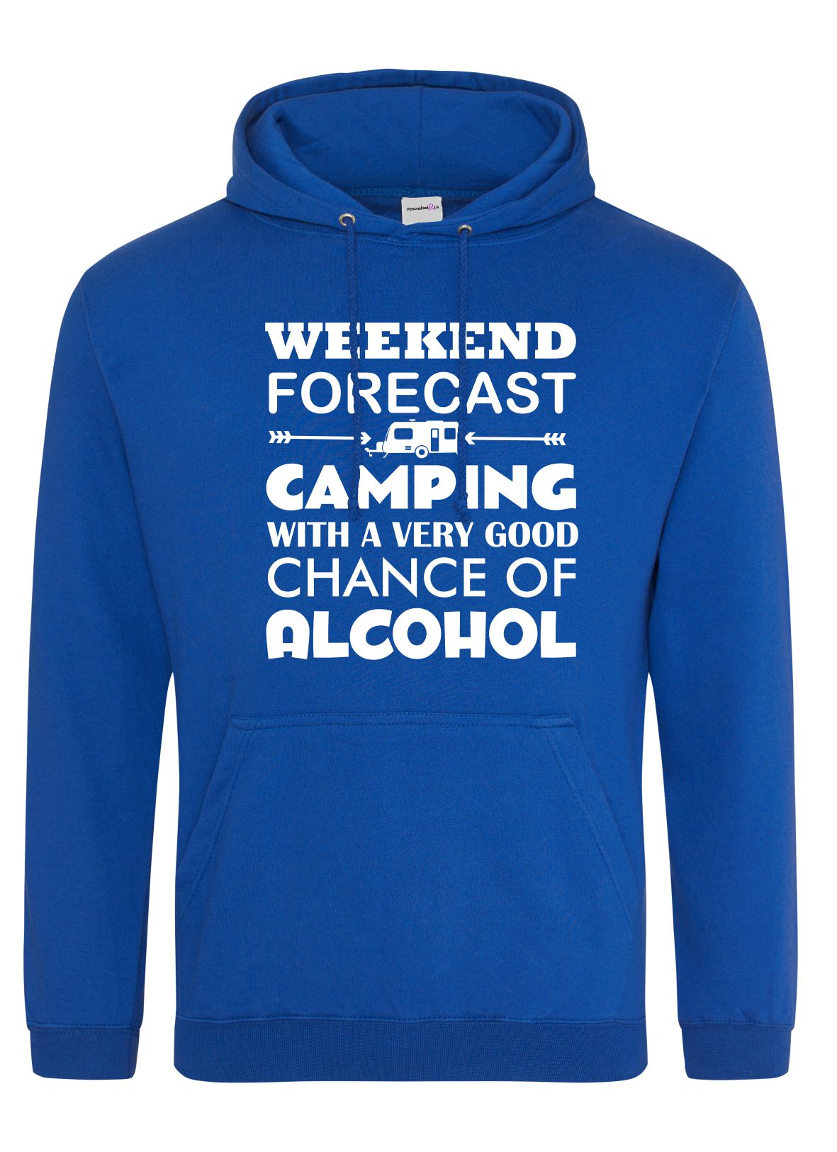 This is our funny Weekend Forecast Camping with a very good chance of Alcohol Caravan Hoodie, Camping which is one of our designs professionally printed onto a high quality hoodie and would be a great addition to your caravan wardrobe.