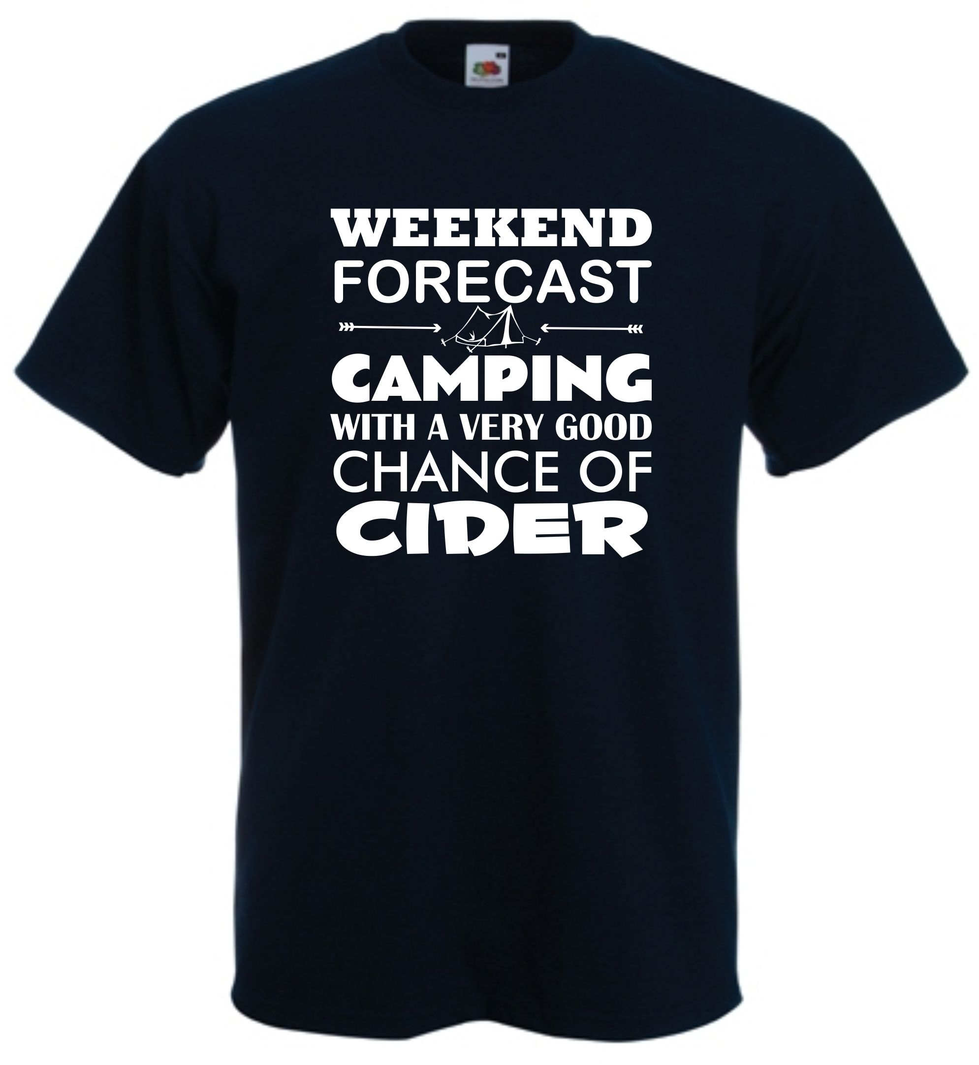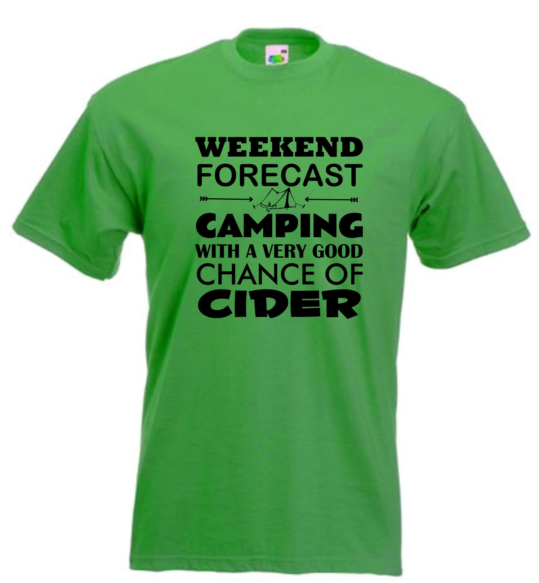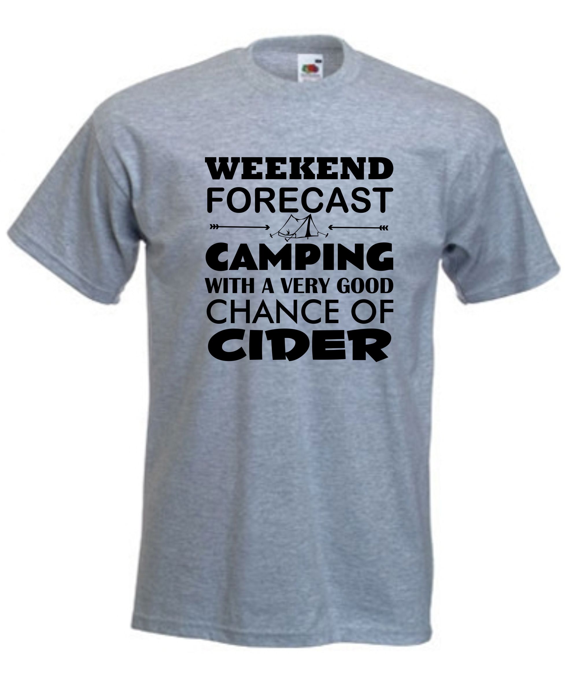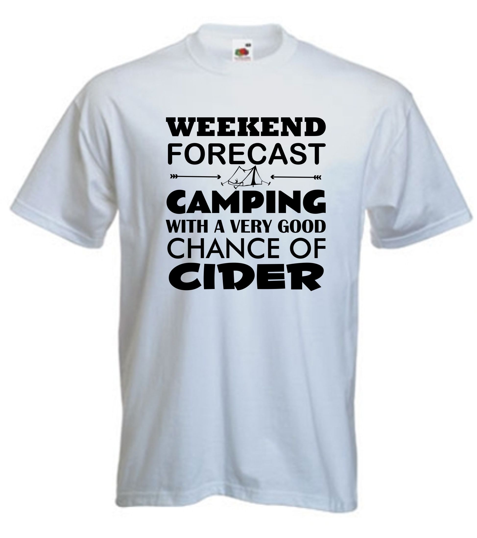 This is our Weekend Forecast – camping with a very good chance of cider t-shirt that would be a great gift for any camping enthusiast.